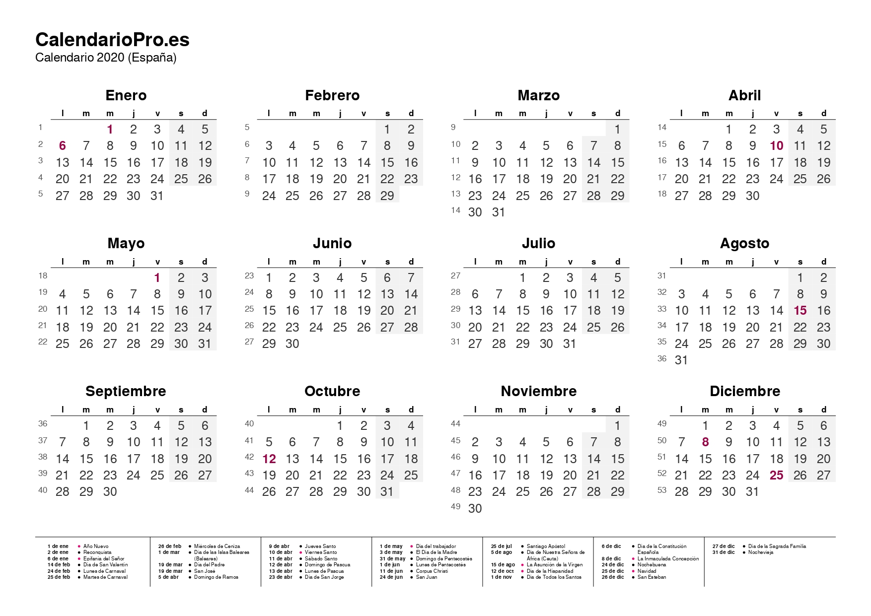 El calendario 2020 te ofrece una visión clara y completa de todos los meses del año, los números de semana y las festividades oficiales. Es una herramienta práctica para comprobar en qué día cae una fecha concreta, organizar vacaciones o planificar tus actividades personales y profesionales a lo largo del año.