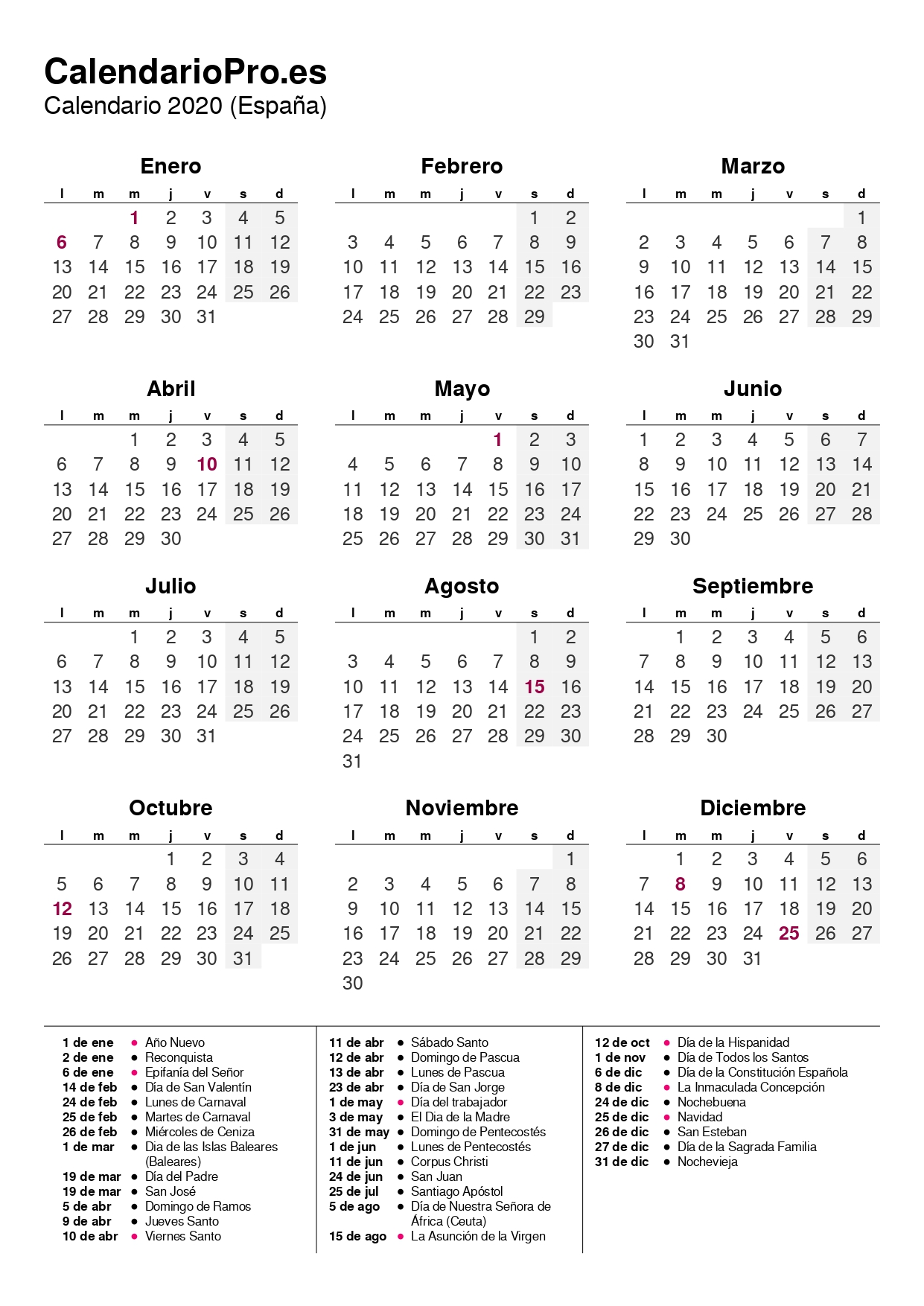 Calendario 2020 con Festivos