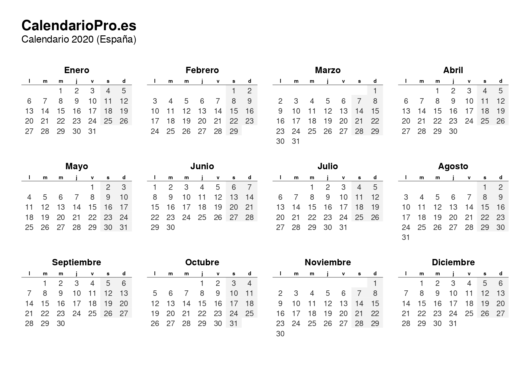 Calendario 2020 sin Festivos