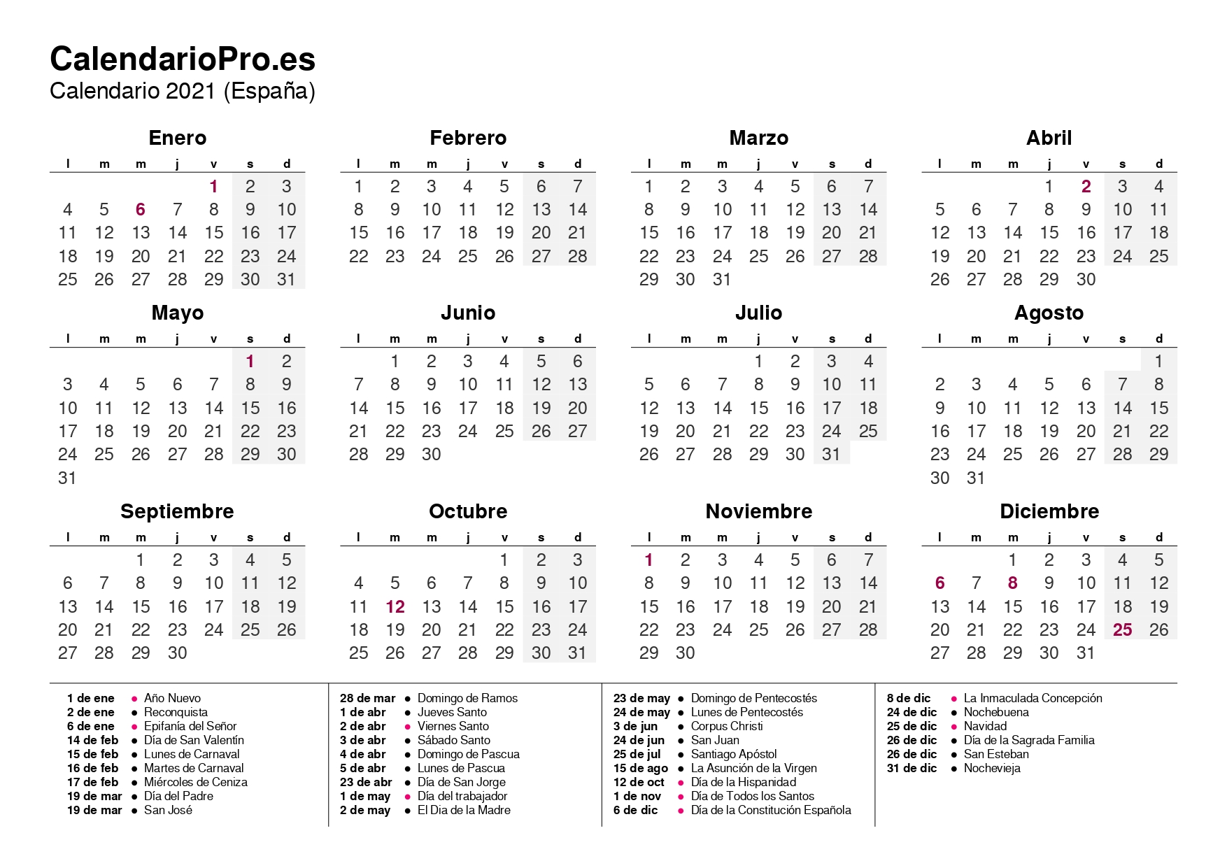 El calendario 2021 te ofrece una visión clara y completa de todos los meses del año, los números de semana y las festividades oficiales. Es una herramienta práctica para comprobar en qué día cae una fecha concreta, organizar vacaciones o planificar tus actividades personales y profesionales a lo largo del año.