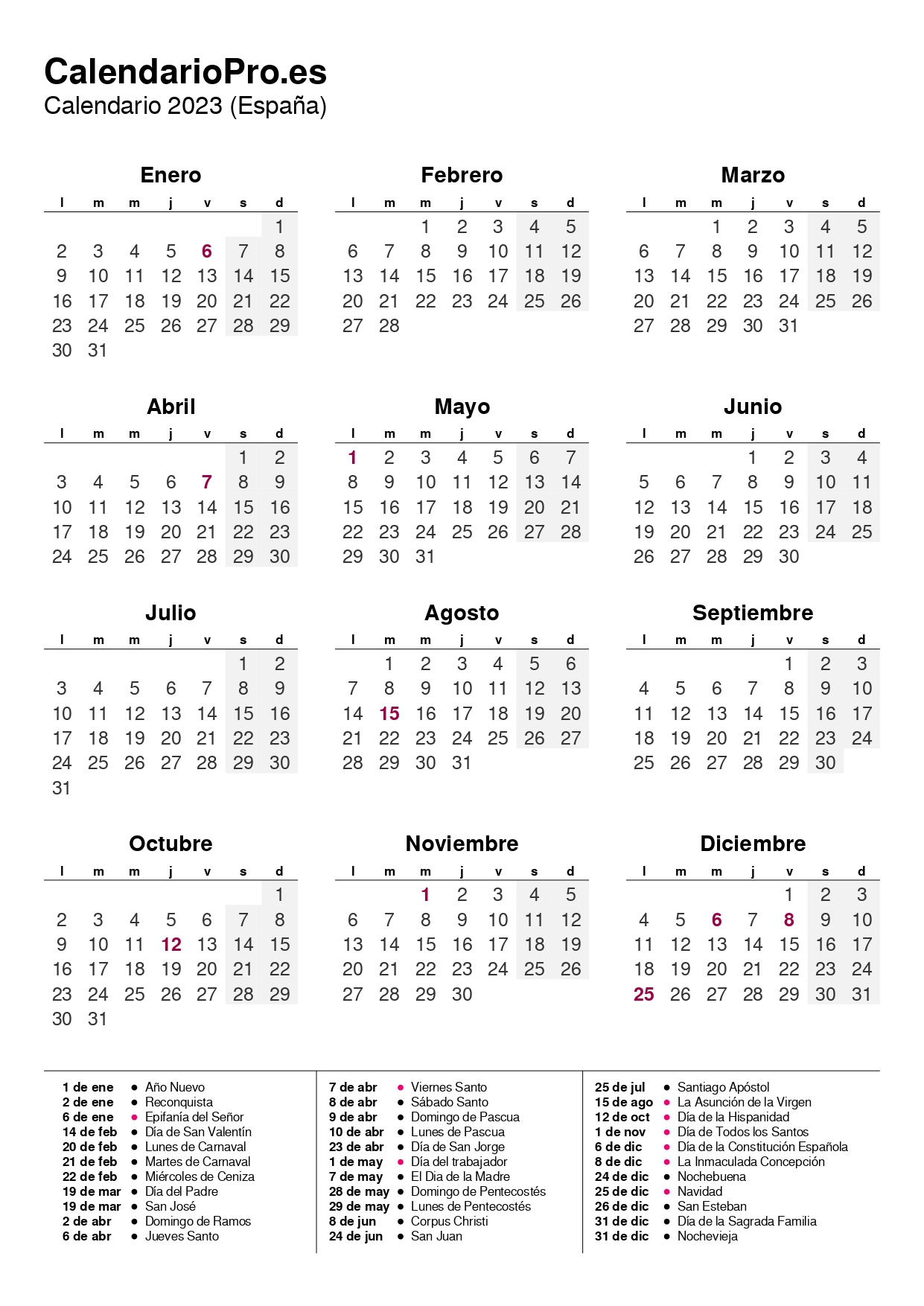 El calendario 2023 te ofrece una visión clara y completa de todos los meses del año, los números de semana y las festividades oficiales. Es una herramienta práctica para comprobar en qué día cae una fecha concreta, organizar vacaciones o planificar tus actividades personales y profesionales a lo largo del año.