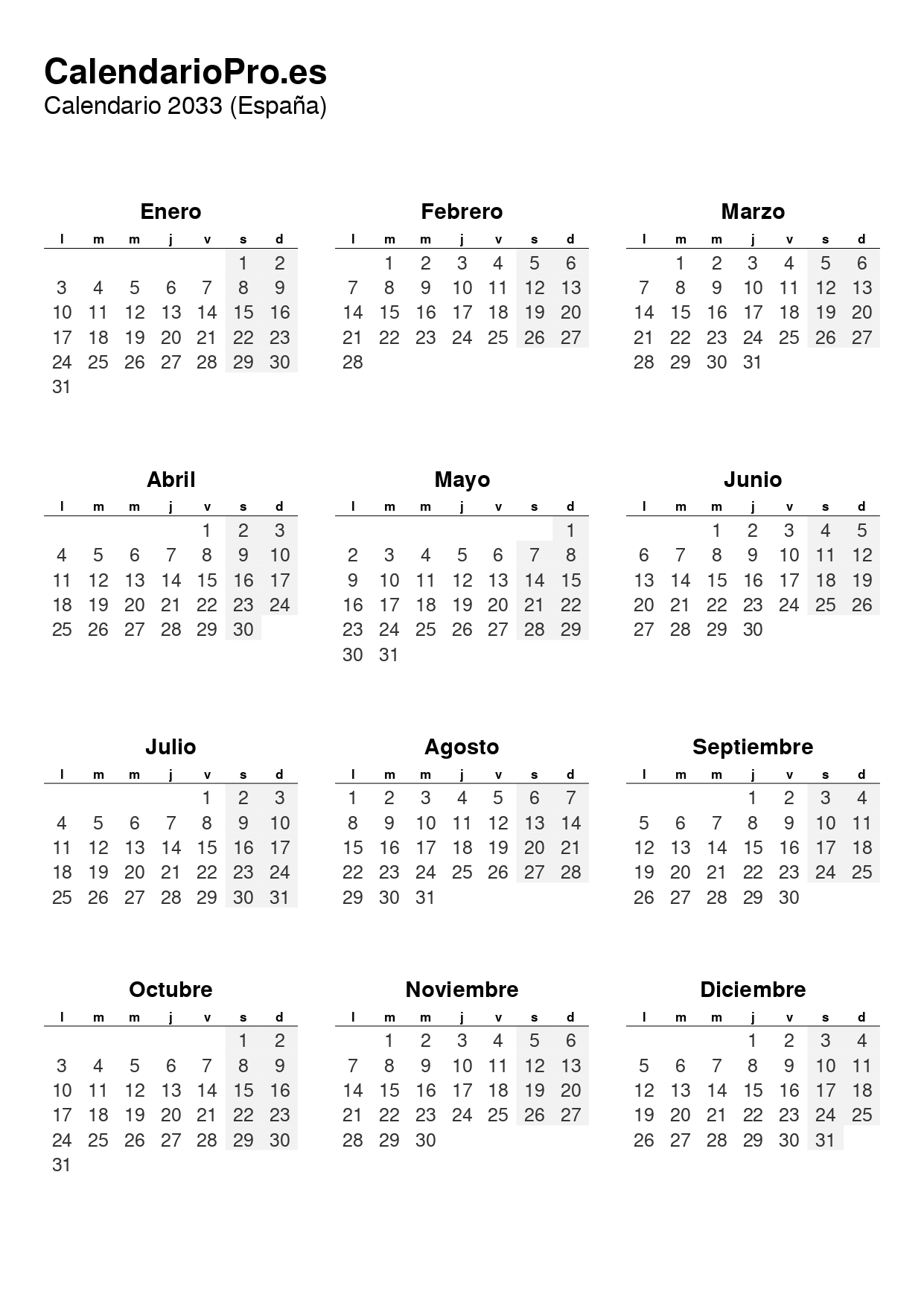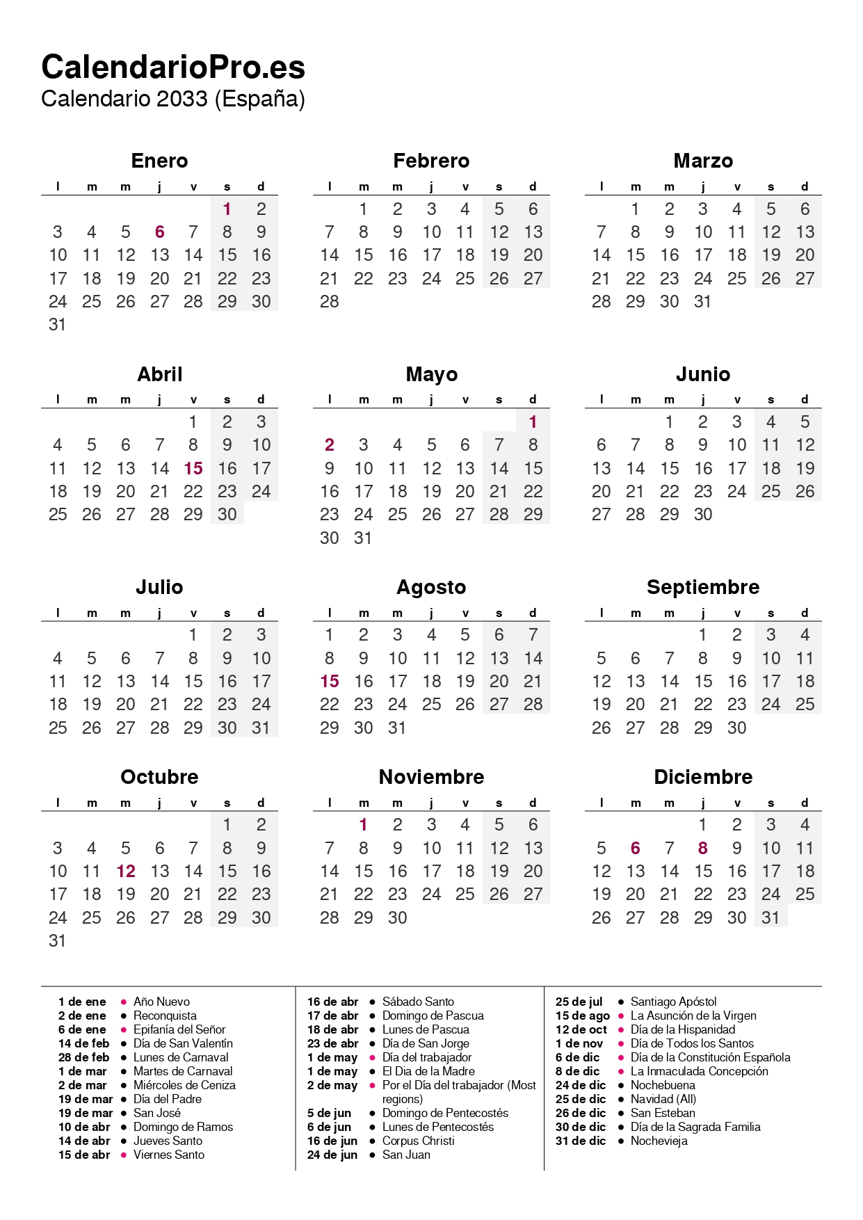 ¿Buscas un calendario 2033 claro y completo, con festivos, para imprimir en casa o en la oficina?