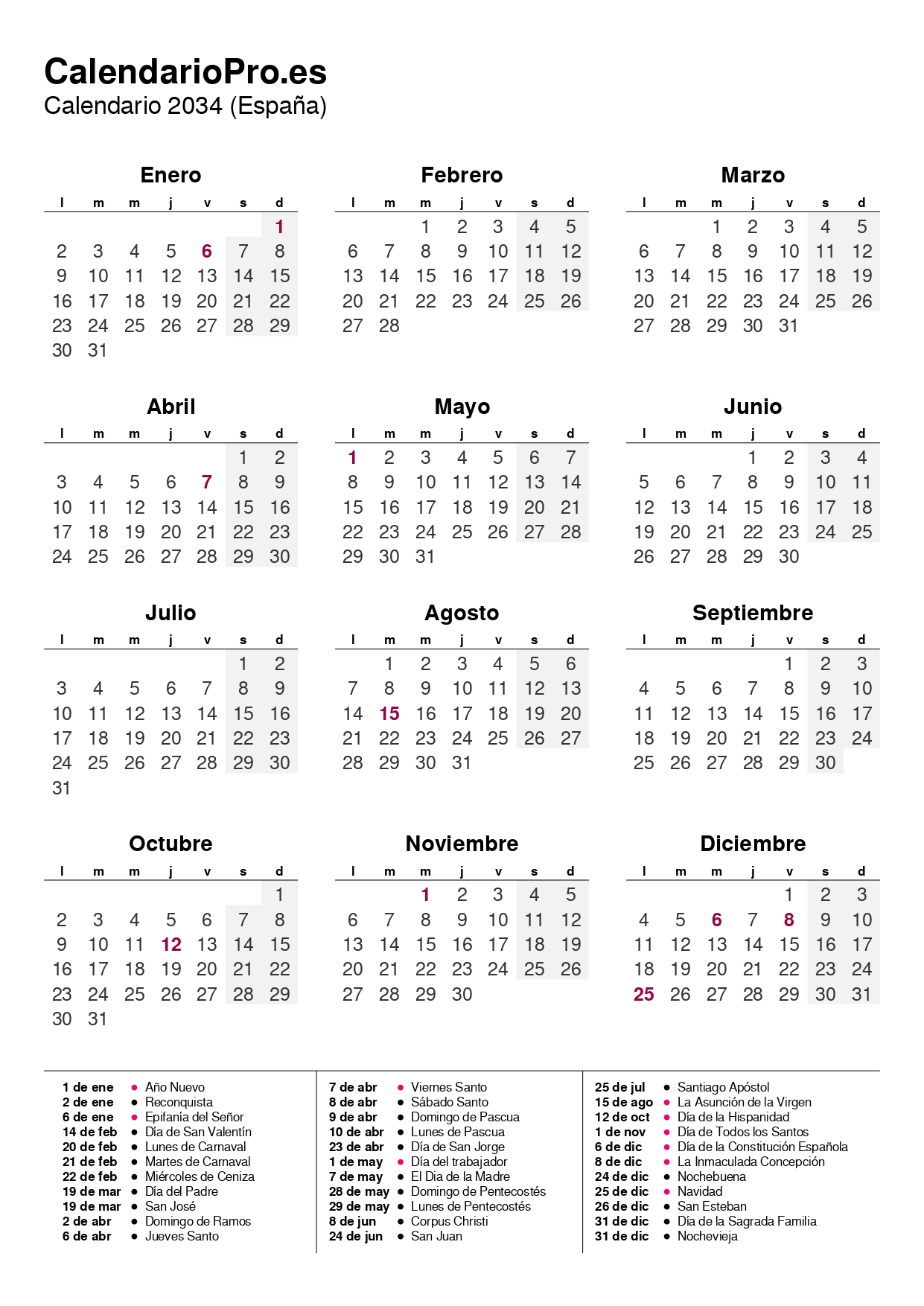 ¿Buscas un calendario 2034 claro y completo, con festivos, para imprimir en casa o en la oficina?