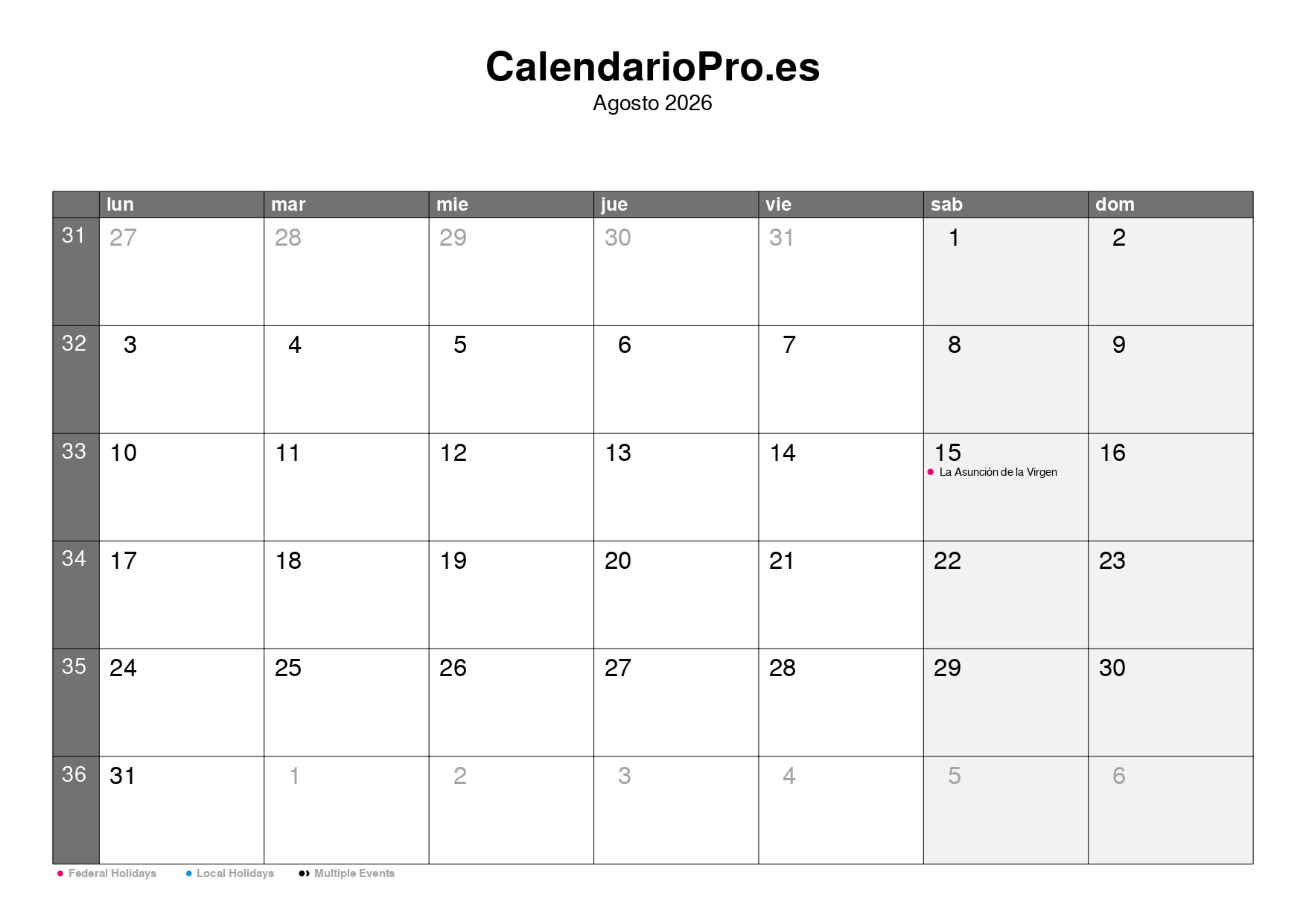 Consulta aquí el calendario mensual de agosto de 2026, con una visión completa de todos los días del mes, los números de semana y las festividades.