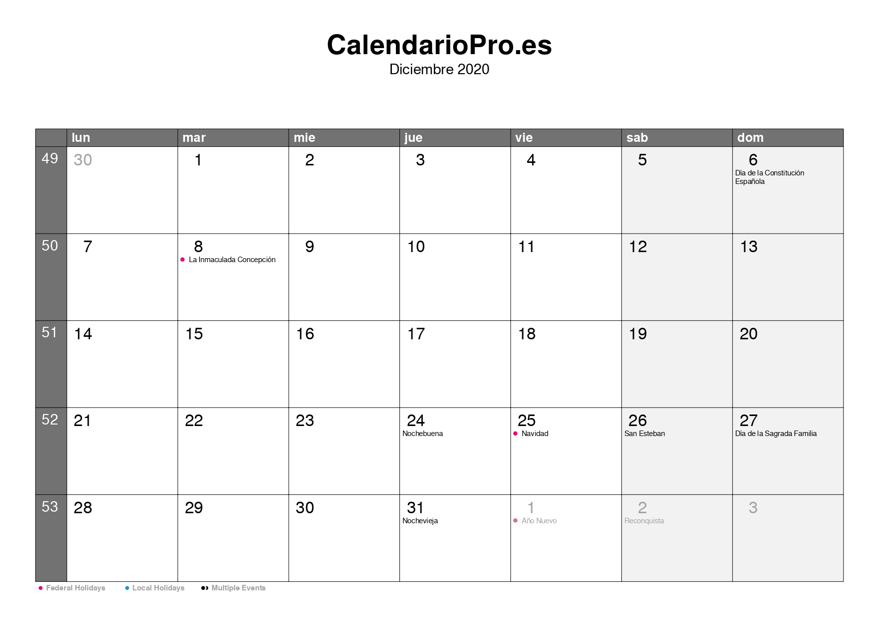 Consulta aquí el calendario mensual de diciembre de 2020, con una visión completa de todos los días del mes, los números de semana y las festividades.