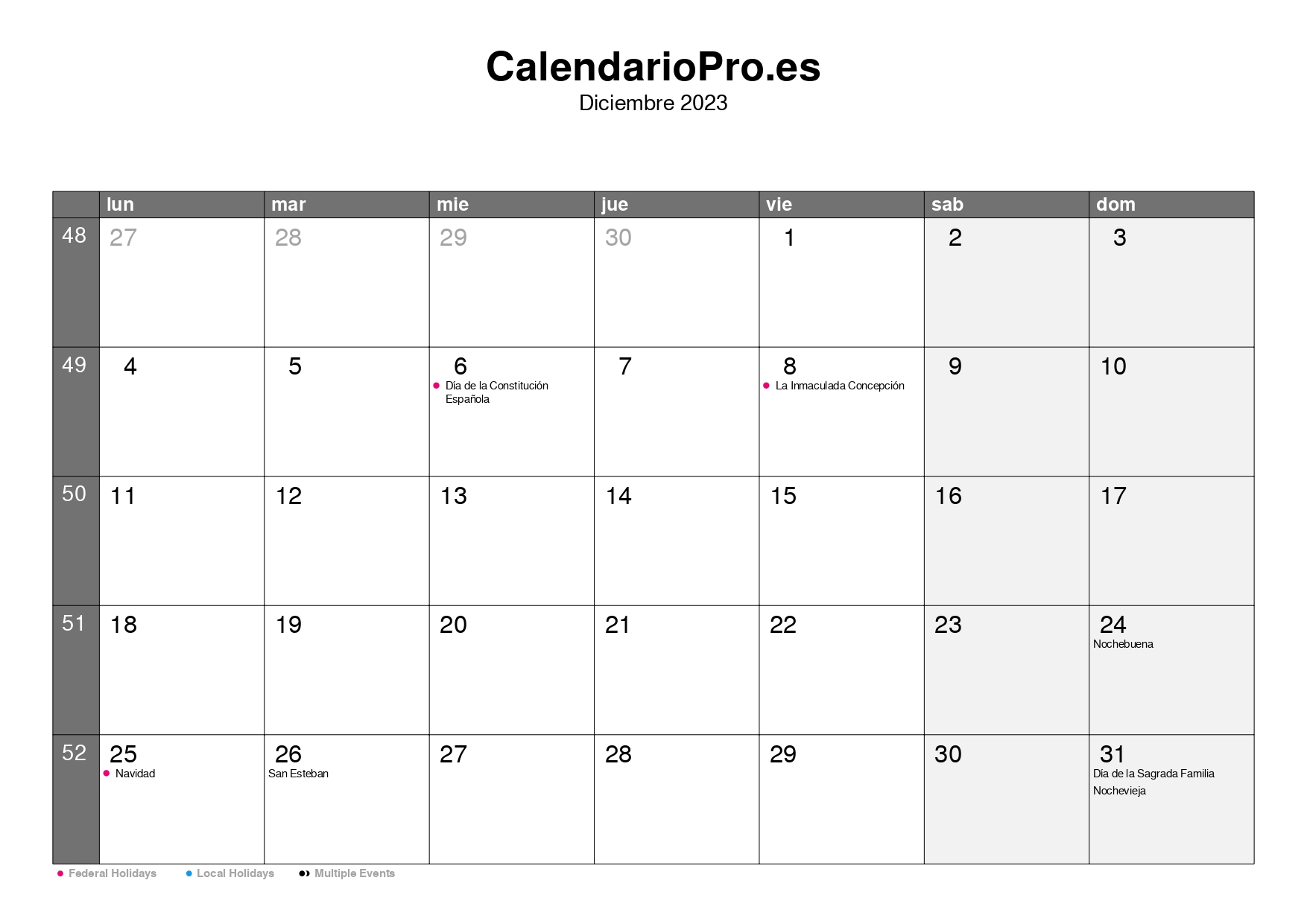 Consulta aquí el calendario mensual de diciembre de 2023, con una visión completa de todos los días del mes, los números de semana y las festividades.