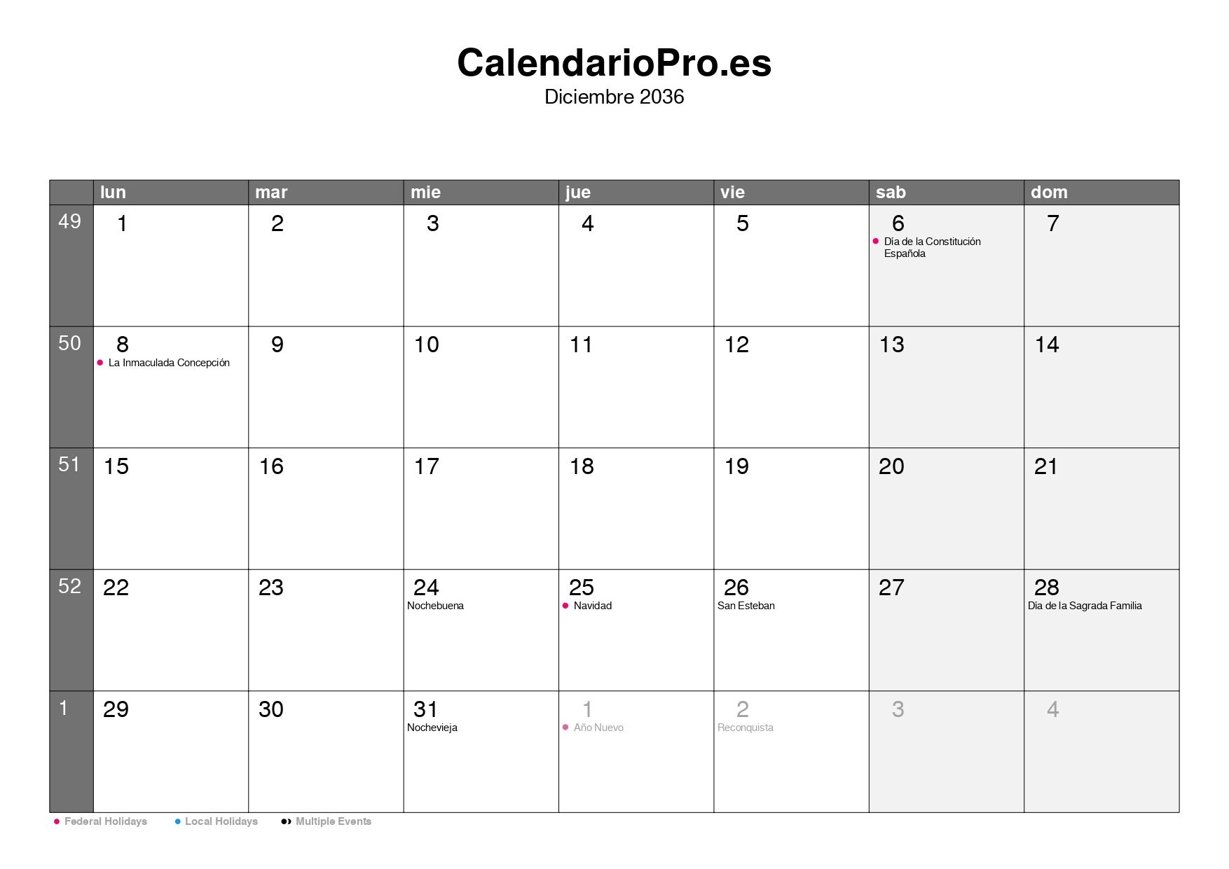 Consulta aquí el calendario mensual de diciembre de 2036, con una visión completa de todos los días del mes, los números de semana y las festividades.