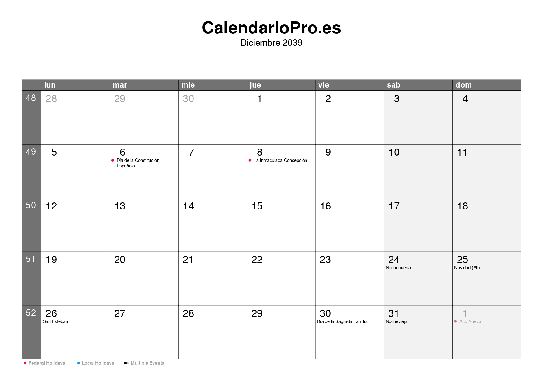 Es una herramienta práctica para comprobar rápidamente en qué día cae una fecha o para organizar tu planificación del mes de diciembre de 2039.