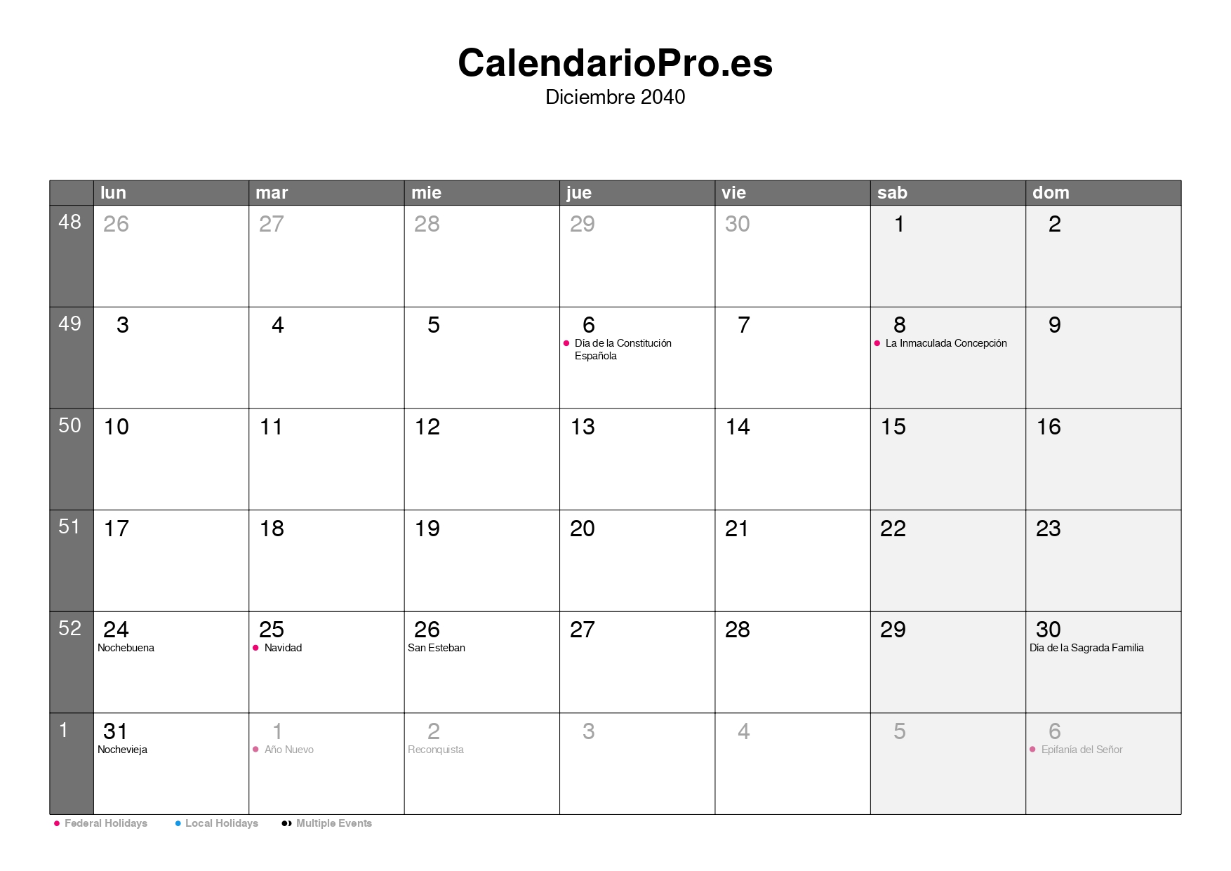 Es una herramienta práctica para comprobar rápidamente en qué día cae una fecha o para organizar tu planificación del mes de diciembre de 2040.