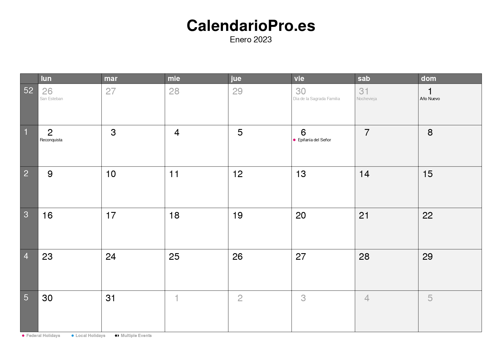 Consulta aquí el calendario mensual de enero de 2023, con una visión completa de todos los días del mes, los números de semana y las festividades.