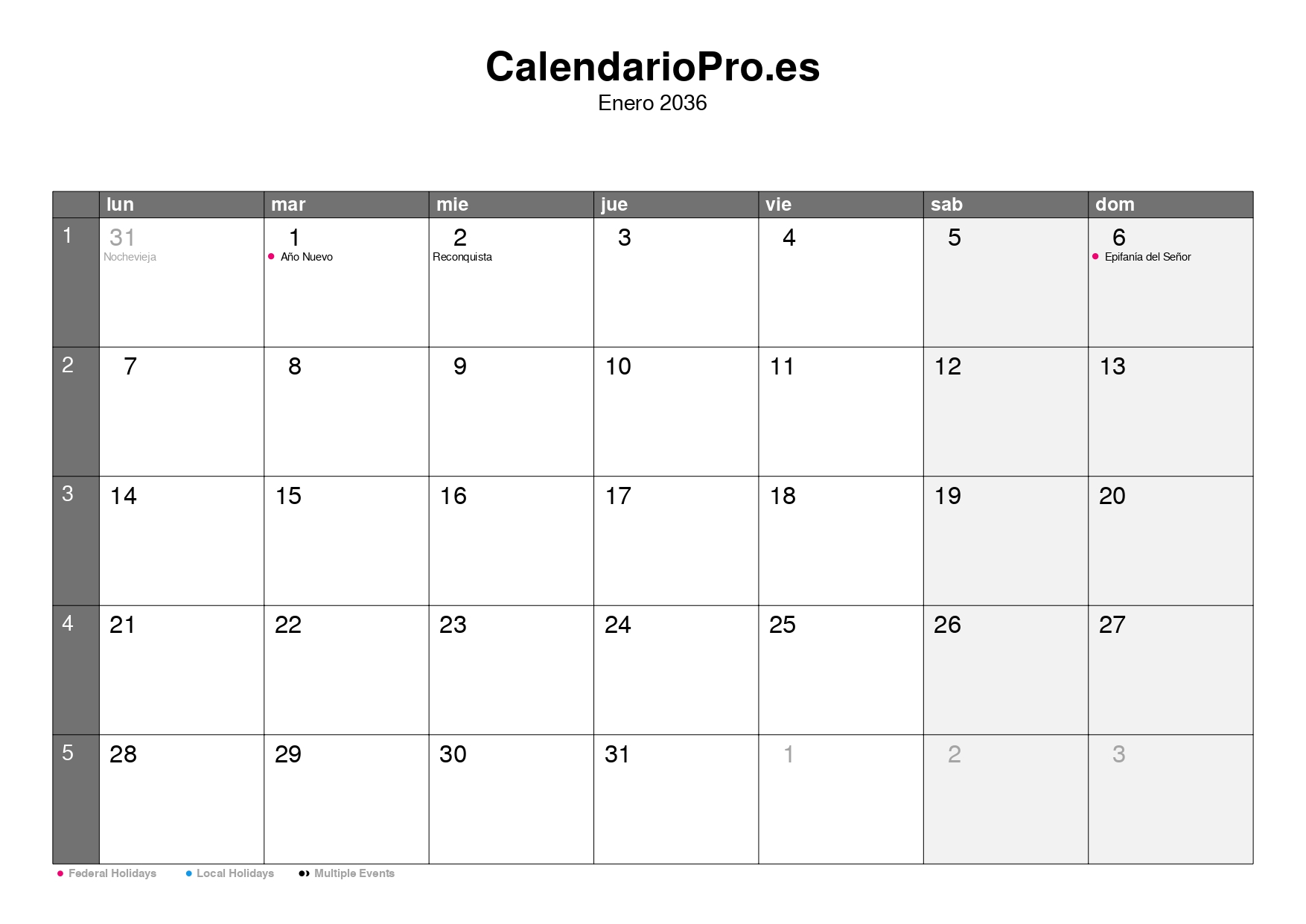 Consulta aquí el calendario mensual de enero de 2036, con una visión completa de todos los días del mes, los números de semana y las festividades.