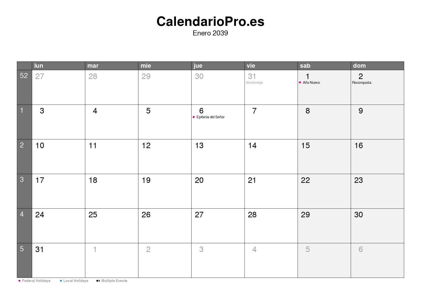 Consulta aquí el calendario mensual de enero de 2039, con una visión completa de todos los días del mes, los números de semana y las festividades.