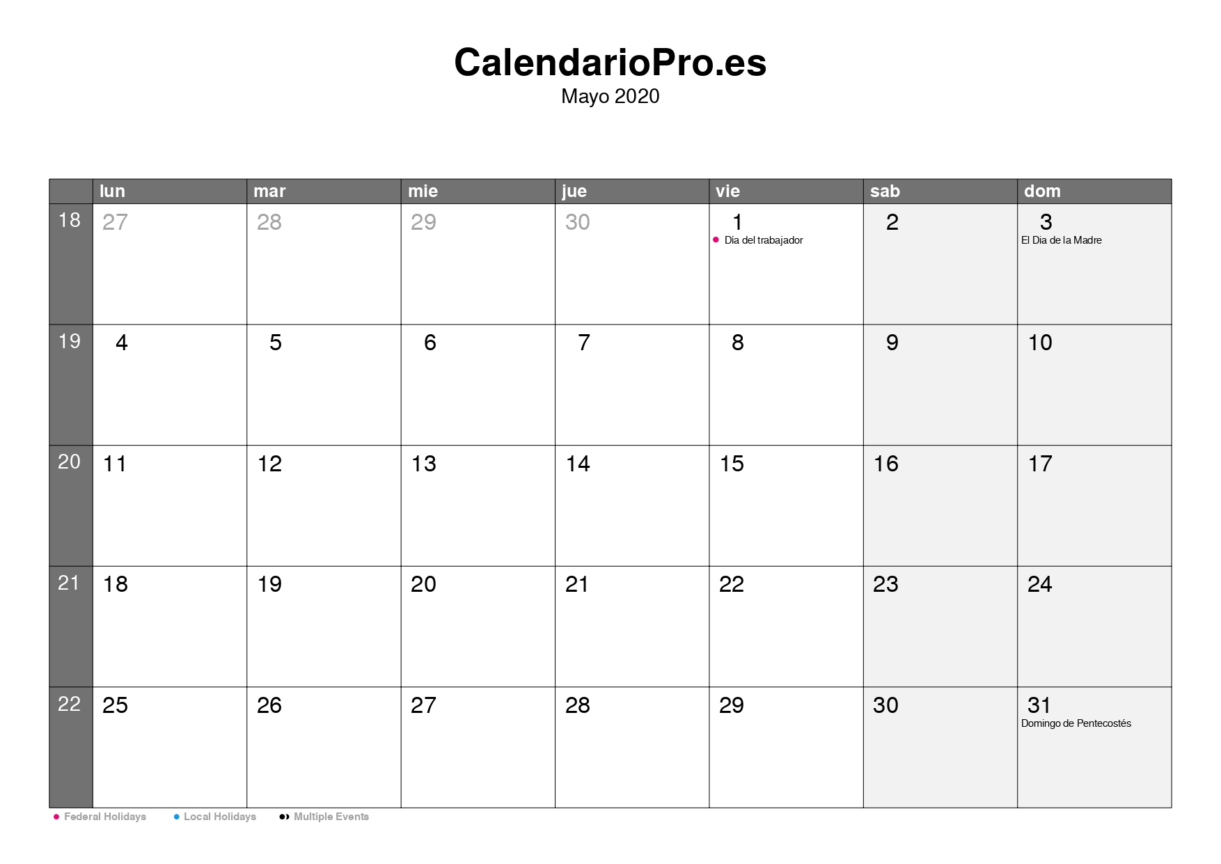 Calendario mayo 2020