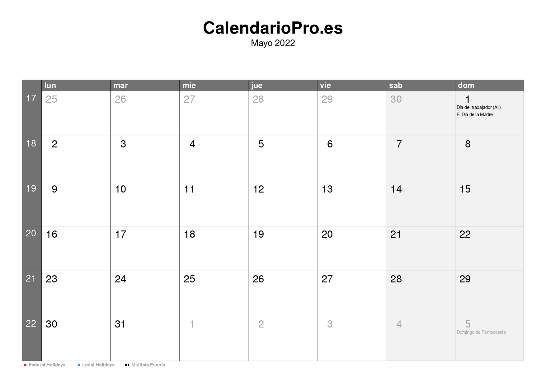 Este calendario de mayo de 2022 te permite ver de un vistazo cuándo caen las vacaciones, los días libres y las citas importantes, facilitando la organización personal, laboral o escolar.
