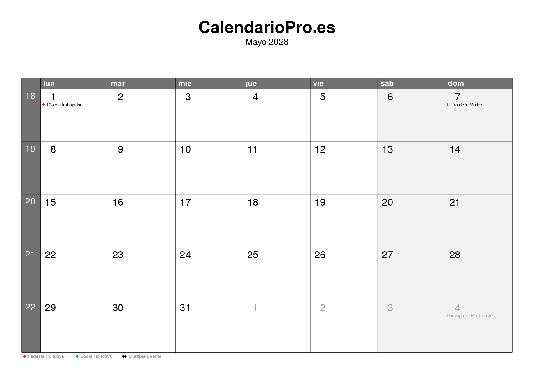 Consulta aquí el calendario mensual de mayo de 2028, con una visión completa de todos los días del mes, los números de semana y las festividades.