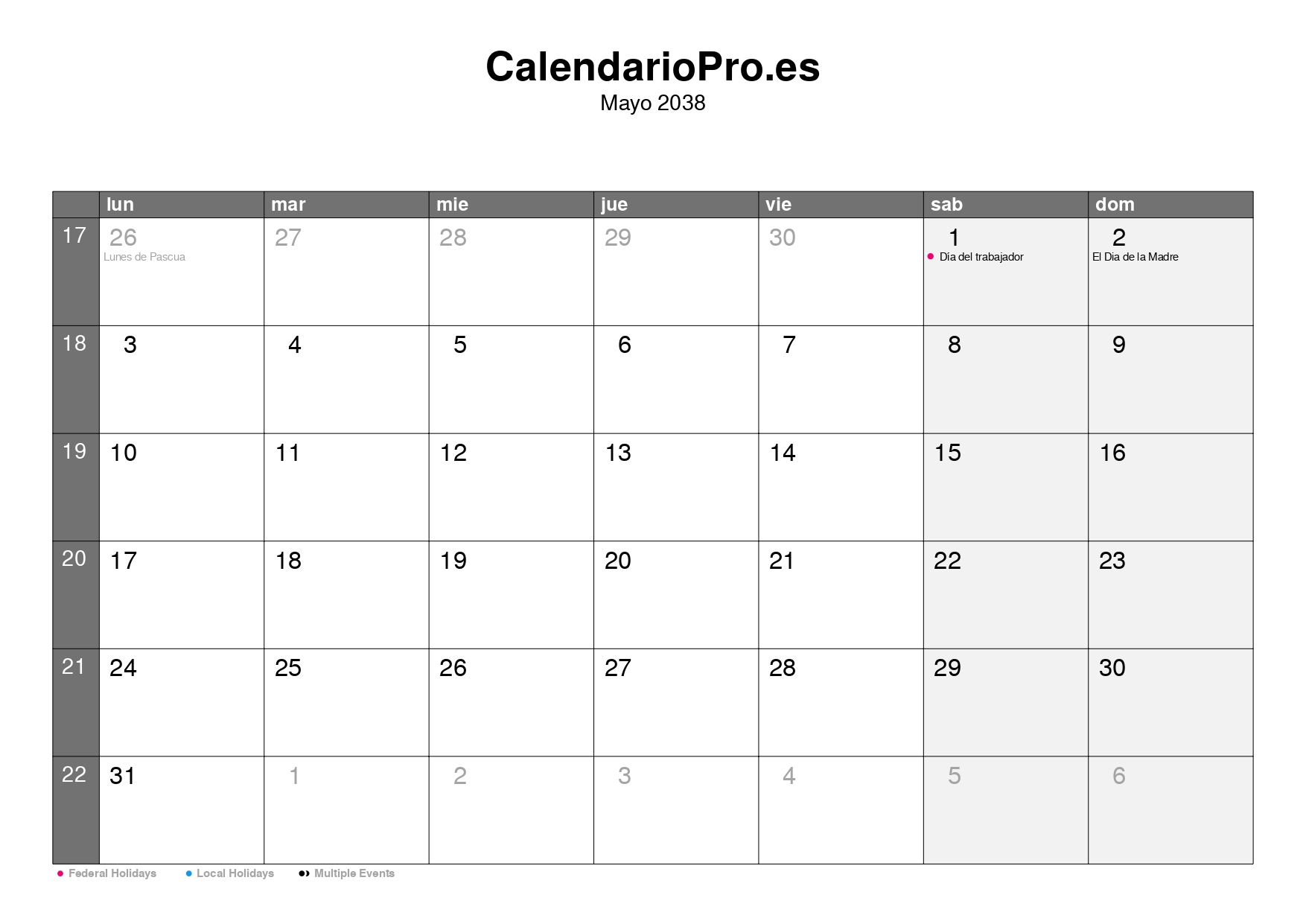 Consulta aquí el calendario mensual de mayo de 2038, con una visión completa de todos los días del mes, los números de semana y las festividades.