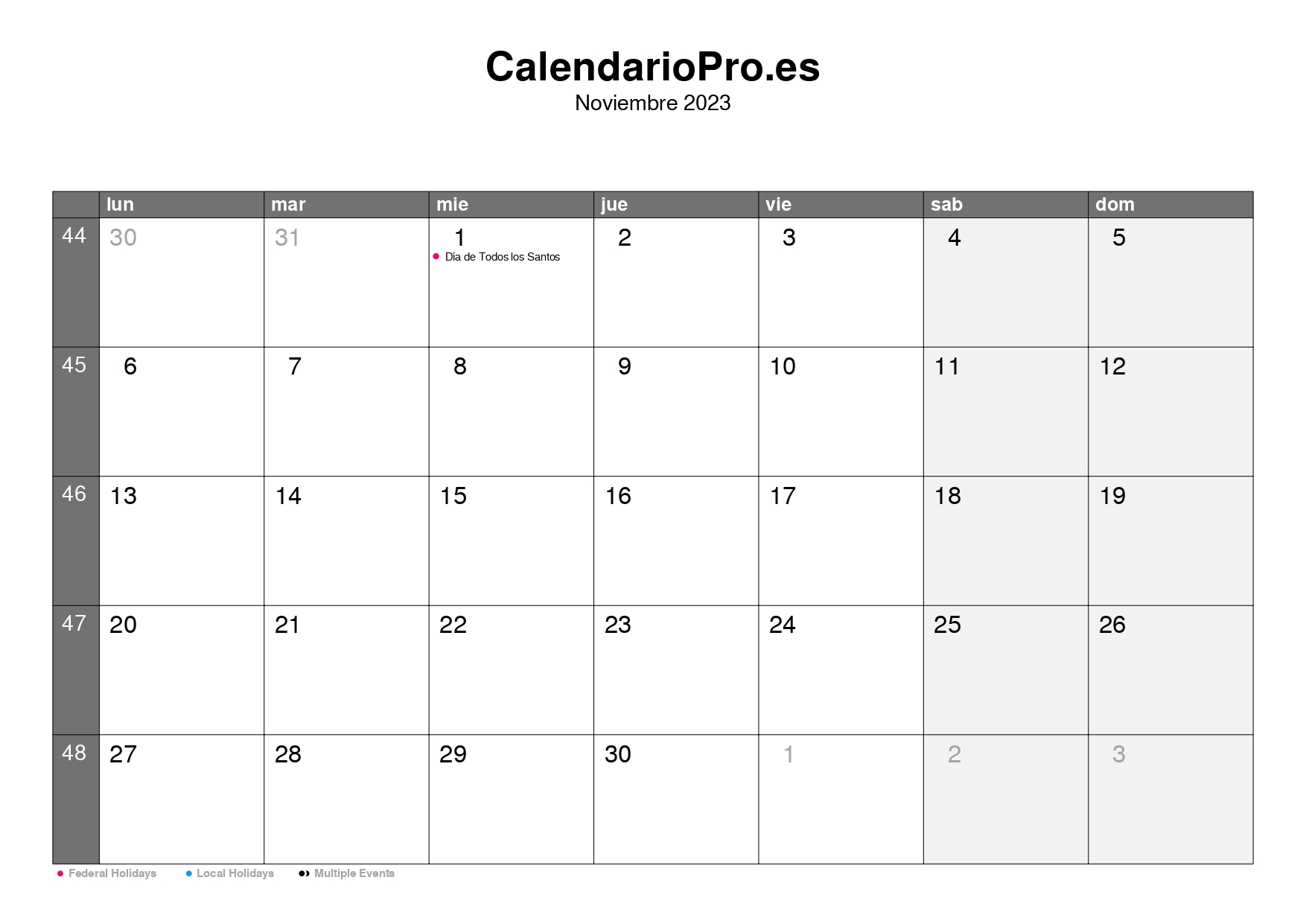 Consulta aquí el calendario mensual de noviembre de 2023, con una visión completa de todos los días del mes, los números de semana y las festividades.