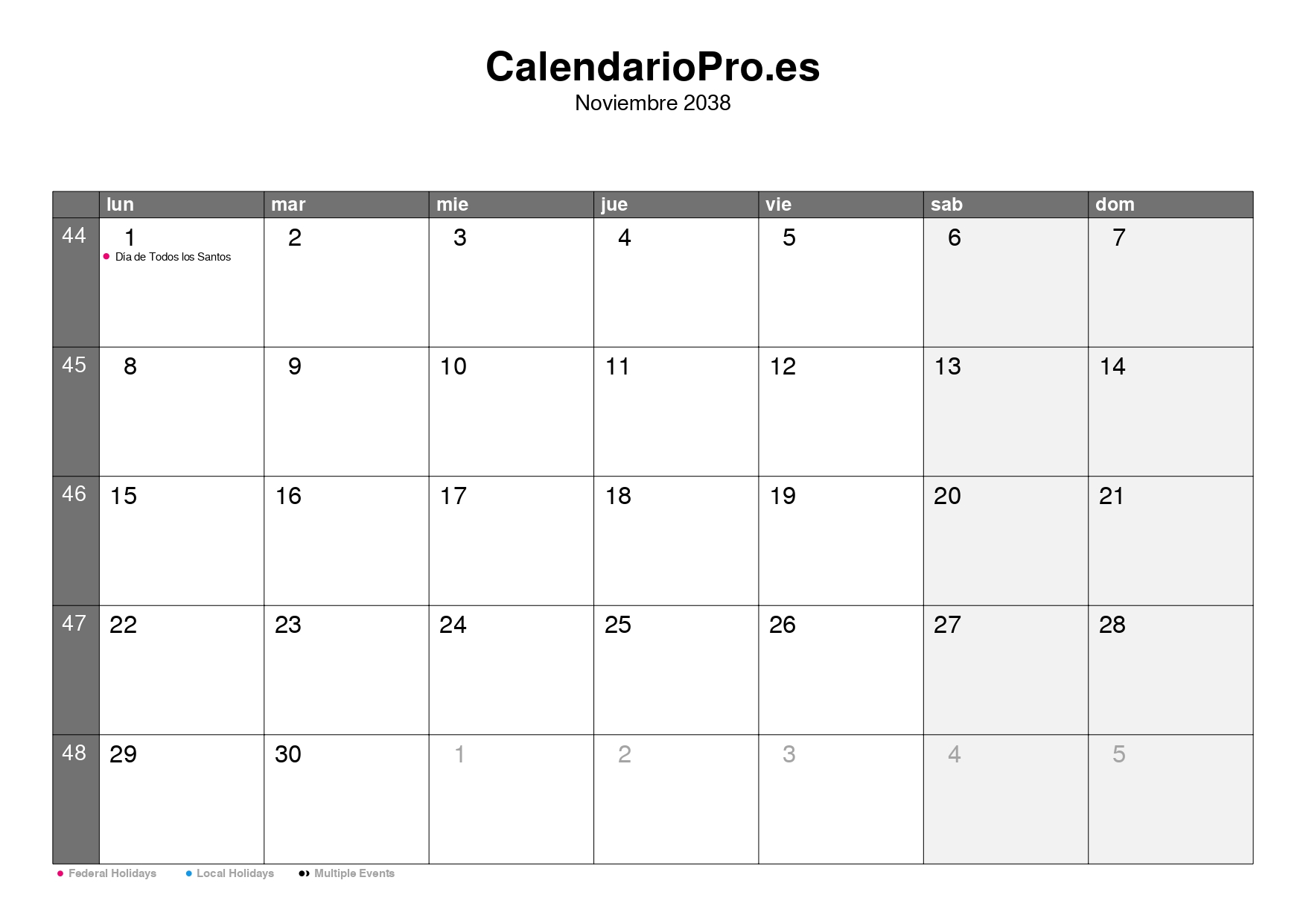 Es una herramienta práctica para comprobar rápidamente en qué día cae una fecha o para organizar tu planificación del mes de noviembre de 2038.
