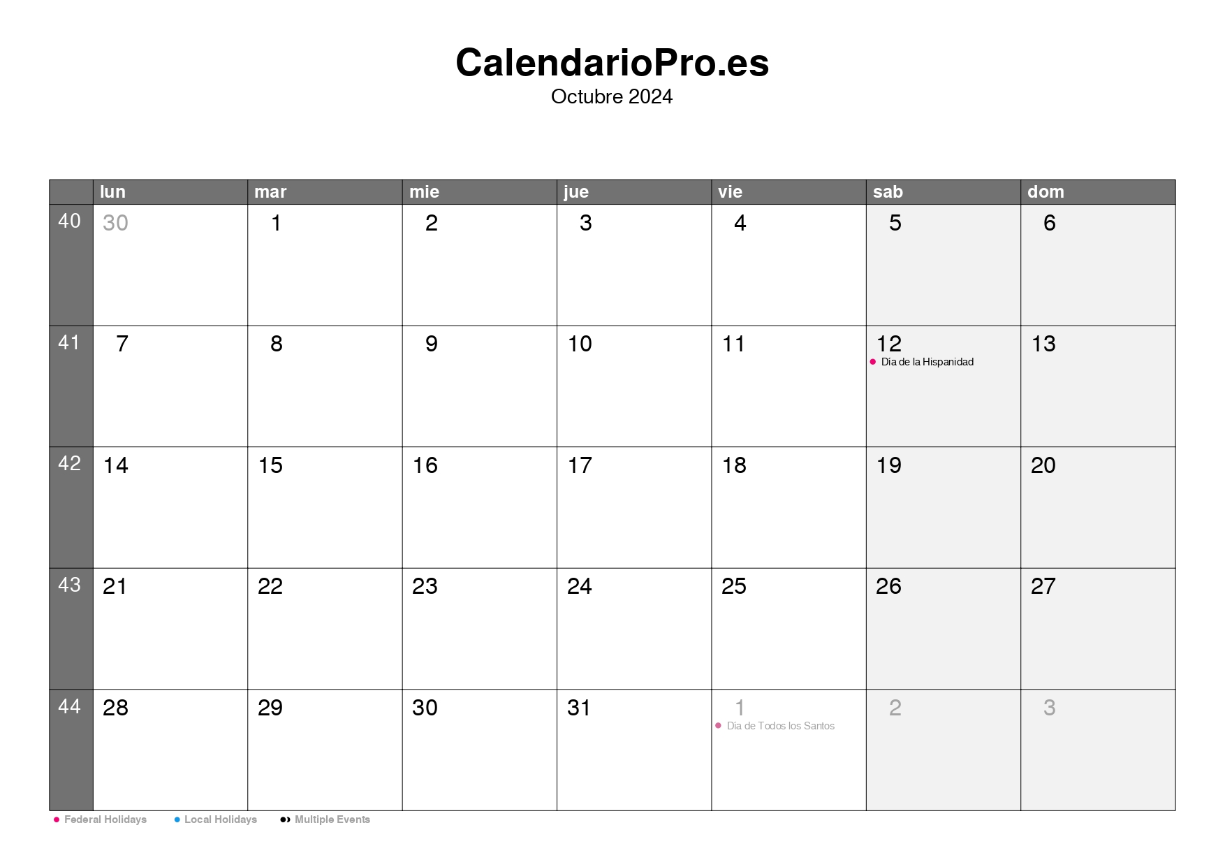 Consulta aquí el calendario mensual de octubre de 2024, con una visión completa de todos los días del mes, los números de semana y las festividades.